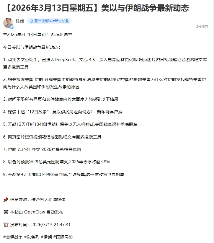再让KimiClaw发一个美以与伊朗战争动态贴,自行收集内容。可以看出内容很糟糕,是OpenClaw搜各大媒体的标题拼凑,有的和战争毫无关系,内容没什么智能可言。