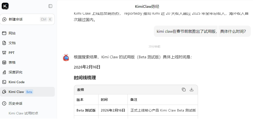 笔者体验下来,发现二者有重大区别。飞书是直连KimiClaw,接收的是OpenClaw的执行结果,能收文件。飞书上的聊天也经过大模型处理是智能的,但由于是非即时沟通,受限于飞书API的格式与字节限制,信息发送要压缩,信息含量有限,例如看不到大模型的思考过程。而在Kimi网页或者Kimi手机APP上,是直接与Kimi大模型聊天,主要内容是大模型输出的,有思考过程,信息明显更丰富;其中夹杂了一些OpenClaw执行指令的结果,但文件收不了,需要发到飞书上。笔者选择与大模型直接聊天的模式,以飞书收文件为辅助。这样能学到很多东西,可以直接提问,出了问题大模型能给出多种解决方案选择,尝试过程可见,是学习探索OpenClaw不错的方式。