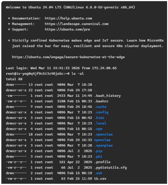 笔者为了理解OpenClaw架构与原理,还有一种最直接的“探索”办法,就是进入KimiClaw“居住”的Linux虚拟机终端,是Ubuntu 24.04系统,KimiClaw网页版提供了入口。如果对Linux操作系统与命令较为熟悉,就可以去仔细看看文件结构,执行多种底层命令,拆解OpenClaw执行任务的过程。如对于OpenClaw的Skills、Memory这些“技能”、“记忆”相关的重要部件,可以直接查看相关文件内容,从最底层揭秘。