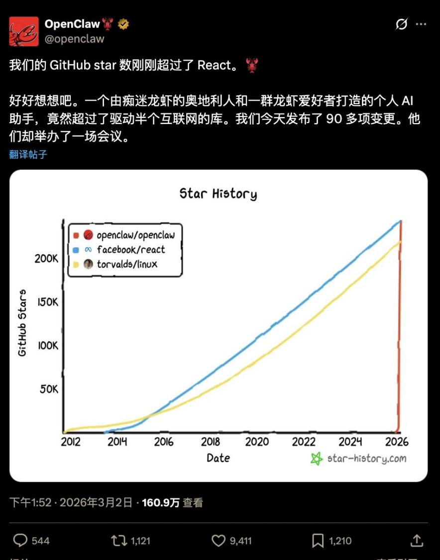 Moltbot于2026年1月30日正式更名为OpenClaw,并于2月24日超过有30年历史的LINUX、3月2日超过React,成为开源社区GitHub史上星标最多的软件项目。近乎垂直的增长曲线成为开源软件历史上的奇观。