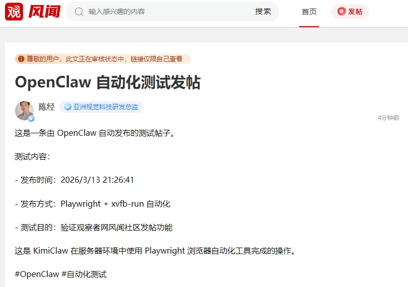 先让OpenClaw自动发了个测试贴。这一步其实很不容易,因为我是用KimiClaw云服务,没有可视化的屏幕。需要好几步,动用了一些工具,才能完成发贴。