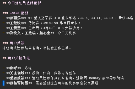 记忆匹配:USER.md 显示关注6位运动员(郑钦文、王欣瑜...)