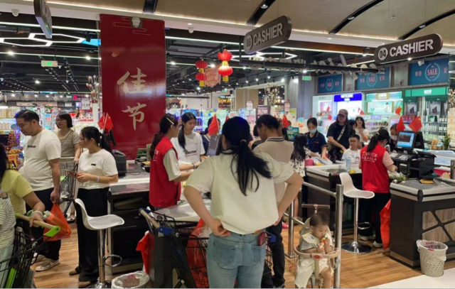 弘宇商场内,促销海报与国旗装饰营造出浓厚的节日氛围。商场联合商户推出抽奖、满减活动,服装、家电等区域客流密集。超市区域同样热闹非凡,货架上摆满了国庆主题包装的零食、粮油及日用品,不少市民推着购物车穿梭其中,精心挑选节日物资。