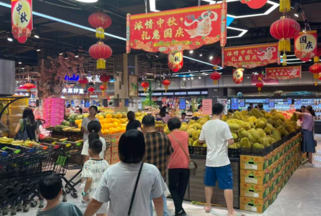 氛围很好,大街上包括商场都挂着国旗,今年国庆的假期比较长,很多人出来游玩,消费者也会增多。