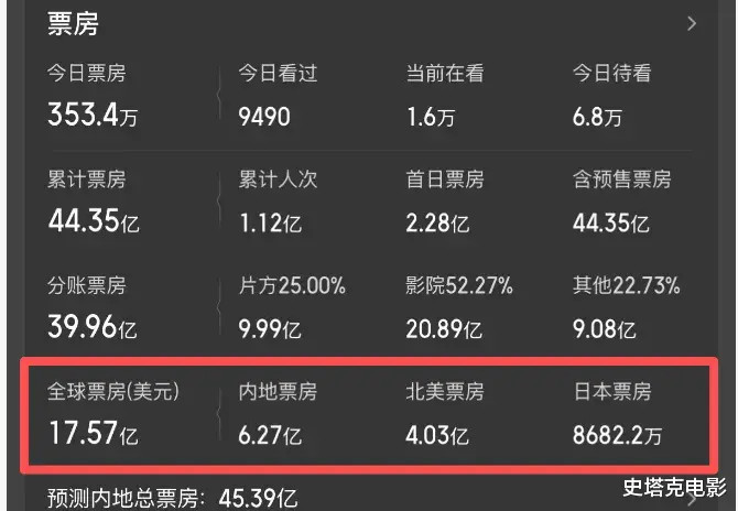 内地总票房是44.3亿,观影人次达到了1.12亿,全球总票房达到了17.57亿美元(123亿人民币),北美4亿美元。